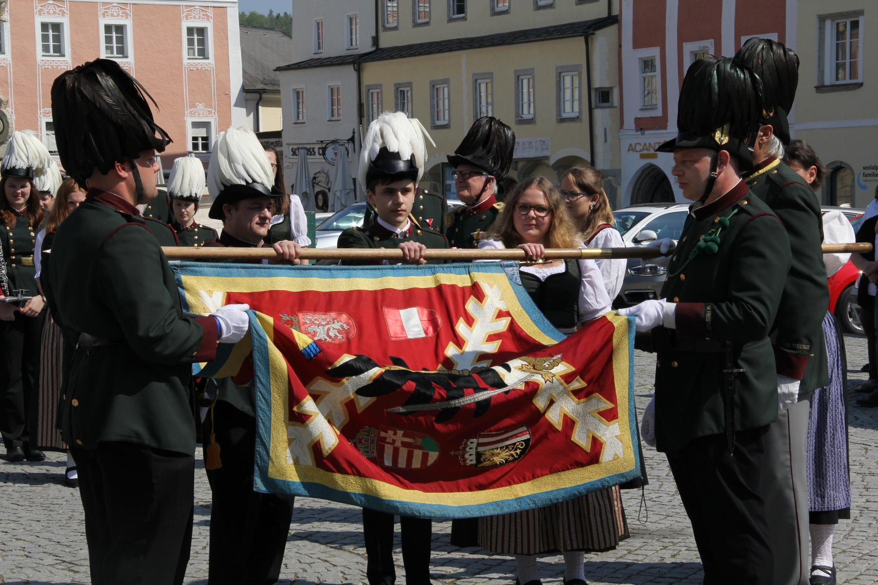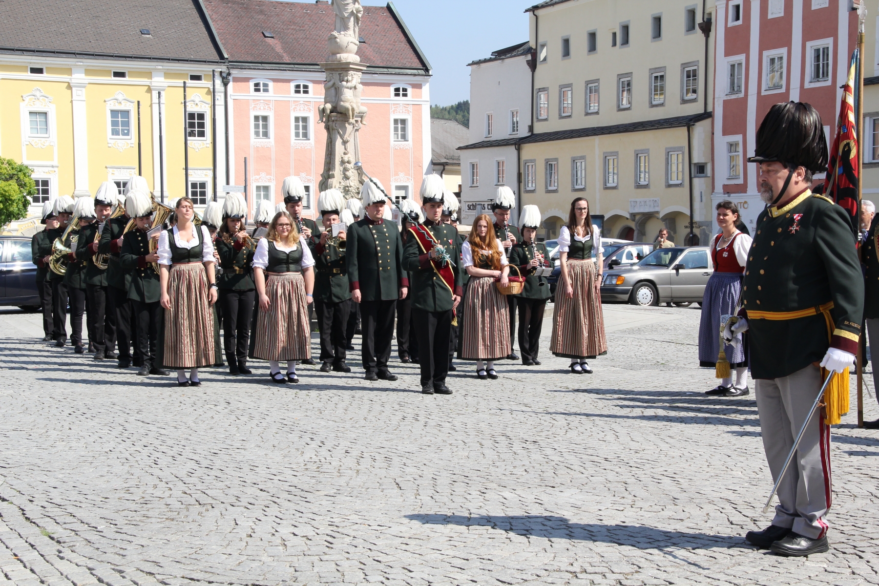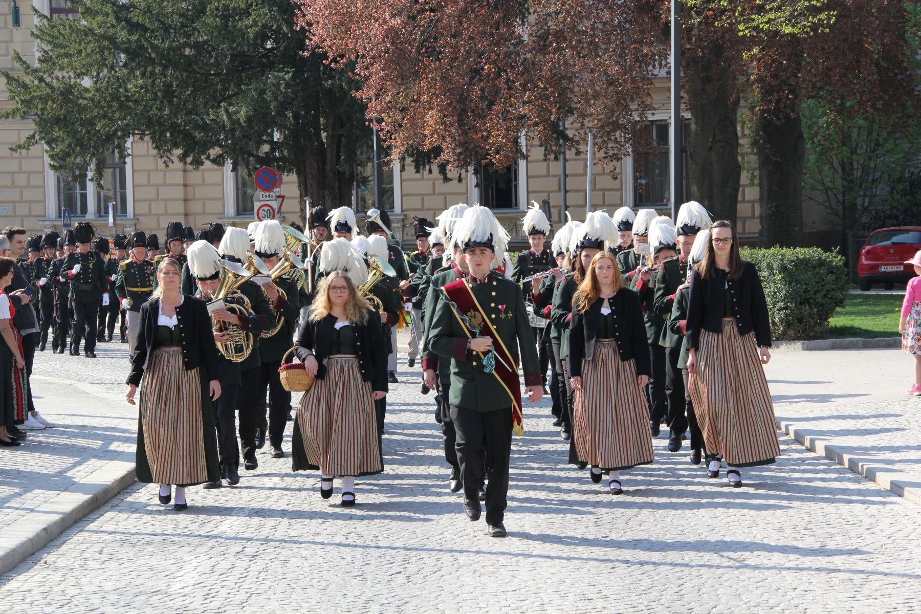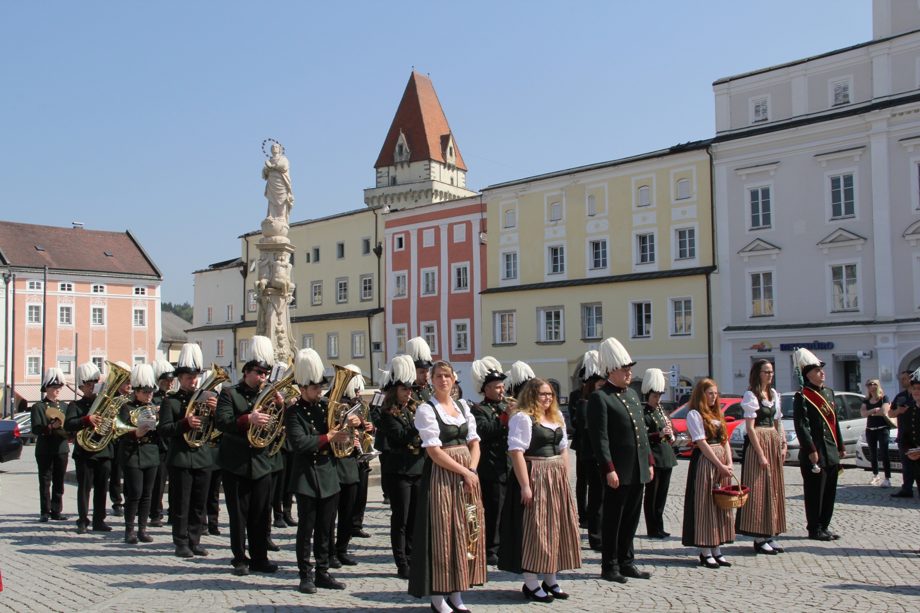 Bei strahlendem Sonnenschein marschierten wir gemeinsam mit dem Bürgerkorps Freistadt, dem Kameradschaftsbund und der Pfadfindergruppe Freistadt durch das Linzer Tor auf den Hauptplatz. Nach der Messe nahmen wir Aufstellung am Hauptplatz und gestalteten die Angelobung und Beförderungen des Bürgerkorps und der Musikkapelle.